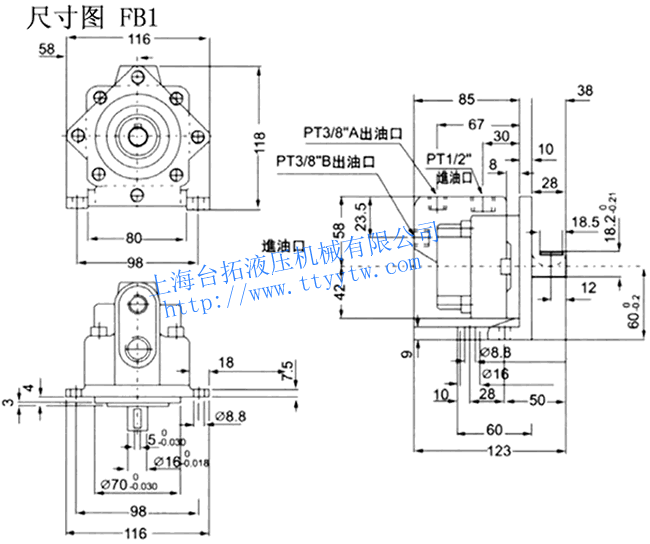 壓力MPa在1800r/min,黏度20cst時的特性 容許轉數(shù)r/min 重量kg 流量?/rev 功率Kw 0.5MPa 3.5MPa 7MPa 0.5MPa 3.5MPa 7MPa 最高 最低 法蘭型 腳座式 FB1-05 4.3 7 7.7 7.2 6.5 0.20 0.75 1.5 2200 600 3.5 4.5 FB1-07 7.0 12.6 11.8 11 0.25 1.05 2.1 FB1-12 12.3 22.7 21.6 21.0 0.35 1.65 3.4 低壓定量葉片泵FB1尺寸圖