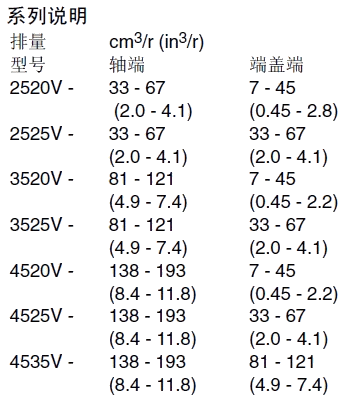 型號(hào) 最大幾何排量cm3/r 最高壓力bar 額定轉(zhuǎn)速r/min 2520V 67軸端 172 1800 45蓋端 207 2525V 67軸端 172 67蓋端 172 3520V 121軸端 172 45蓋端 207 3525V 121軸端 172 67蓋端 172 4520V 193軸端 172 45蓋端 207 4525V 193軸端 172 67蓋端 172 4535V 193軸端 172 121蓋端 172