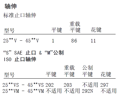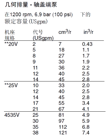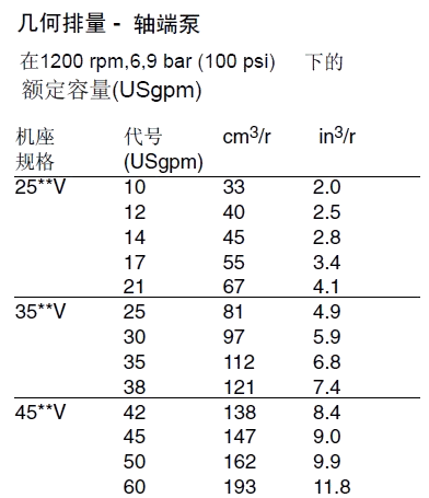 35,38,45備注:1、排量代號(hào)是在1200r/min和0.69Mpa(100psi)下的額定USgpm。2、轉(zhuǎn)速限制:a.最低轉(zhuǎn)速,所有型號(hào)和油液搭配600r/min。b.最高轉(zhuǎn)速:標(biāo)準(zhǔn)型號(hào)用抗磨液壓油1800r/min;標(biāo)準(zhǔn)型號(hào)用合成液和油包水乳化液1200r/min;用水乙二醇的型號(hào)1500r/min。