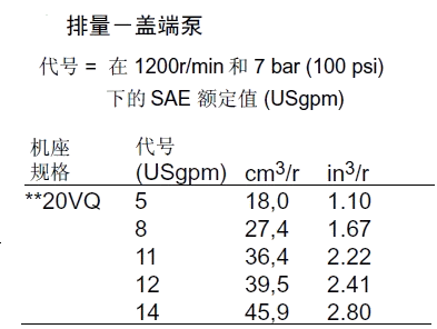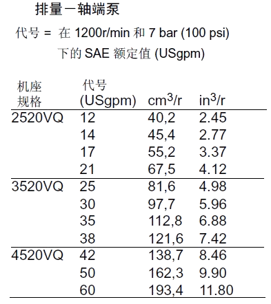 KW2520VQ 12 40.2 2700 210 88.5 41.0 5 18.0 2700 210 42.3 17.9 20.5 8 27.4 210 65.4 26.1 14 45.4 2700 103.8 46.6 11 36.4 210 88.5 35.4 17 55.2 2500 119.2 51.8 12 39.5 160 98.1 28.4 21 67.7 2500 146.2 61.9 14 45.9 140 115.4 29.1 3520VQ 25 81.6 2500 210 173.1 75.3 5 18.0 2500 210 38.5 16.5 34.0 8 27.4 210 61.5 24.0 30 97.7 2500 211.5 87.7 11 36.4 210 80.8 33.0 35 112.8 2400 230.8 98.5 12 39.5 160 90.4 26.1 38 121.6 2400 250.0 104.4 14 45.9 140 105.8 26.8 3525VQ 25 81.6 2500 210 173.1 75.3 12 40.2 2500 210 79.5 38.0 34.5 30 97.7 2500 211.5 87.7 14 45.4 210 91.0 43.0 35 112.8 2400 230.8 98.5 17 55.2 210 119.2 51.5 38 121.6 2400 250.0 104.4 21 67.5 210 146.2 61.9 4520VQ 42 138.7 2200 175 255.8 91.4 5 18.0 2200 210 32.0 14.5 43.0 8 27.4 210 51.0 21.0 50 162.3 2200 303.8 105.2 11 36.4 210 68.0 28.5 12 39.5 160 77.5 23.0 60 193.4 2200 369.2 126.8 14 45.9 140 91.0 24.0 4525VQ 42 138.7 2200 175 255.8 91.4 12 40.2 2200 210 68.0 33.0 46.0 14 45.4 210 79.5 38.0 50 162.3 2200 303.8 105.2 17 55.2 210 100.0 45.5 60 193.4 2200 369.2 126.8 21 67.5 210 125.0 54.5 4535VQ 42 138.7 2200 175 255.8 91.4 25 81.6 2200 210 145.5 66.5 53.6 30 97.7 210 178.0 77.5 50 162.3 2200 303.8 105.2 35 112.8 210 211.5 89.5 60 193.4 2200 369.2 126.8 38 121.6 210 223.0 97.0 備注:性能常數(shù):SAE 10W油液@82℃(180華氏度),泵進(jìn)口@0PSIG(14.7PSIA),出口壓力必須始終高于進(jìn)口壓力。