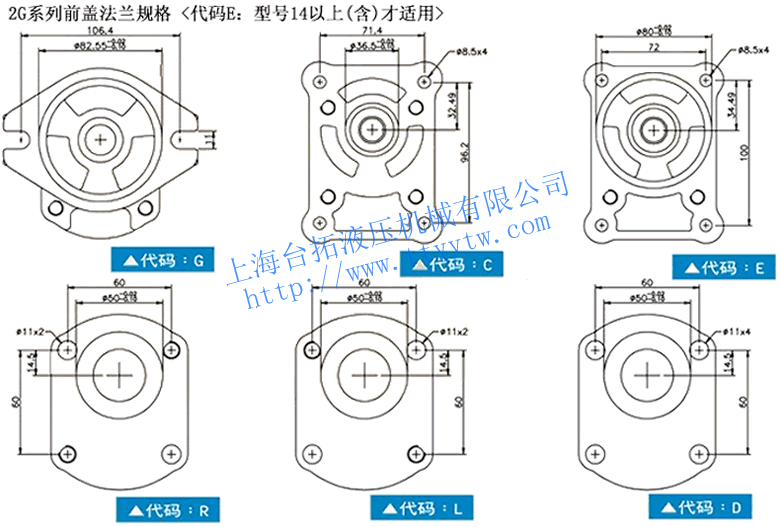 2 G G 1 P 16 R 系列 型式/功能 前蓋法蘭規(guī)格 軸伸規(guī)格 出入油口規(guī)格 型號 旋向 備注:1、R表示右轉(zhuǎn),面向軸伸順時(shí)針;L表示左轉(zhuǎn),面向軸伸逆時(shí)針。2、假設(shè)您所要的前泵排量是16.0ml/rev,旋向是右旋,正確的訂購型號:2GG1P16R。