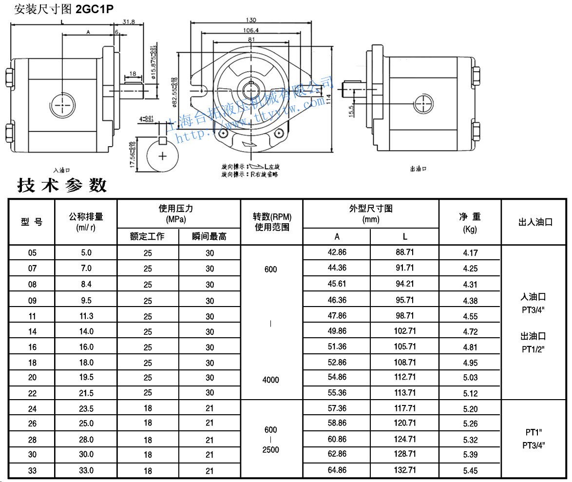 kg出入油口 額定工作 瞬間最高 A L 2GG1P05 5.0 26 30 600-4000 42.86 88.71 4.17 入油口