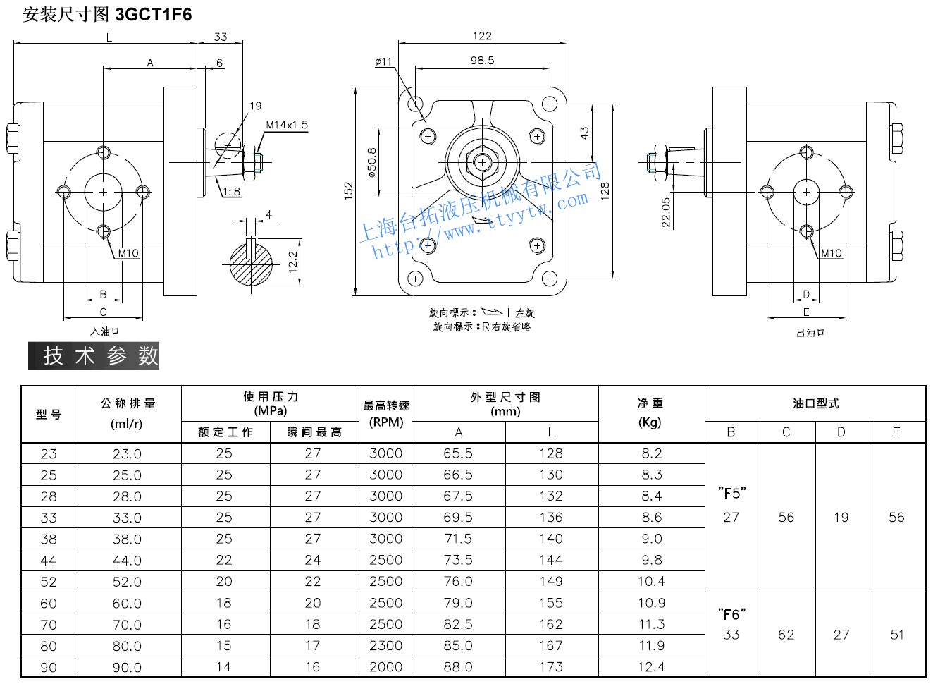 513GCT1F670 40.0 16 18 2500 82.5 162 11.3 3GCT1F680 80.0 15 17 2300 85.0 167 11.9 3GCT1F690 90.0 14 16 2000 88.0 173 12.4 高壓齒輪泵3GCT1F6尺寸圖