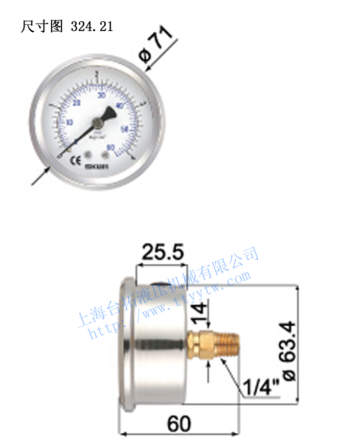 型號(hào) 充油式壓力表324.21 尺寸大小 63mm 精確度 Class±1.5% 壓力范圍 -1/0~-1+20kg/cm2(bar) 0/1~0/1000kg/cm2(bar) 溫度范圍限制 運(yùn)轉(zhuǎn)時(shí)溫度最大值60℃(因考慮傳導(dǎo)特性),周?chē)鷾囟燃s-25℃~60℃ 接頭尺寸與材料 銅合金,直立或埋入