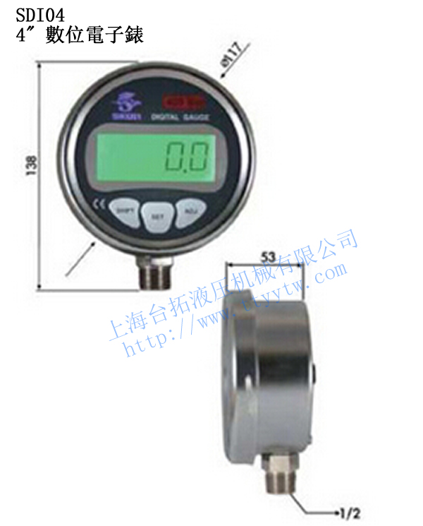 1、數(shù)位接點式壓力表SDI04,背光顯示,歸零設(shè)定,單位切換8種Si,Bar,kg/cm2,Kpa,Mpa,inHg,cmHg,Atm,感測器SUS316一體成型,防漏。