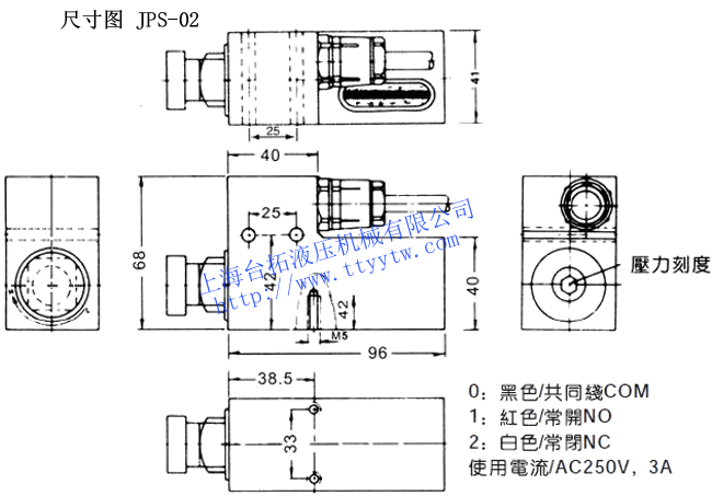 型號 使用壓力范圍 Mpa 最高使用壓力 Mpa 重量 Kg JPS-02HM 3~21 21 1.45 JPS-02L 2.5~6 7 JPS-02LL 0.5~6 7 備注:其它規(guī)格:1.建議切換頻率最大20次/分。2.絕緣阻抗:100MΩmin。(電磁500V測試)3.接點(diǎn)阻抗:30MΩMax。4.電介體強(qiáng)度:1000VAC 50/60HZ測試(1分鐘)。