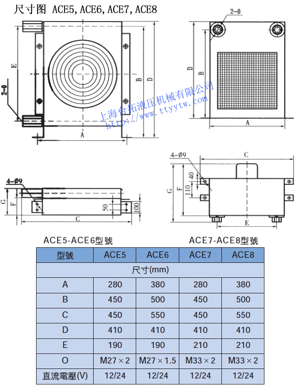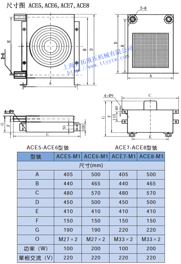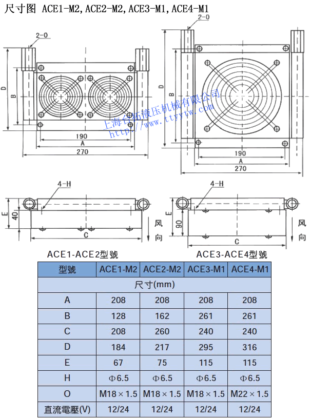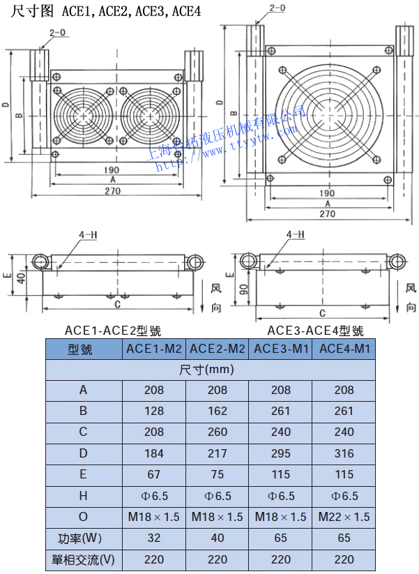 型號 牙口ZG 通過量?/min 工作壓力MPa 最高壓力MPa 風扇功率W ACE1-M2 M18×1.5 10 2.0 2.5 30 ACE2-M2 M18×1.5 20 2.0 2.5 40 ACE3-M1 M18×1.5 25 2.0 2.5 65 ACE4-M1 M22×1.5 30 2.0 2.5 65 ACE4-M2 M22×1.5 60 2.0 2.5 130 ACE5-M1 M27×1.5 55 2.0 2.5 100 ACE6-M1 M27×2 100 2.0 2.5 200 ACE7-M1 M33×2 120 2.0 2.5 100 ACE8-M1 M33×2 160 2.0 2.5 200 ACE9-M2 ZG1-1/2" 250 2.0 2.5 200 ACE10-M2 ZG1-1/2" 300 2.0 2.5 400 ACE11-M3 ZG1-1/2" 400 2.0 2.5 600 風冷機ACE系列外形尺寸圖