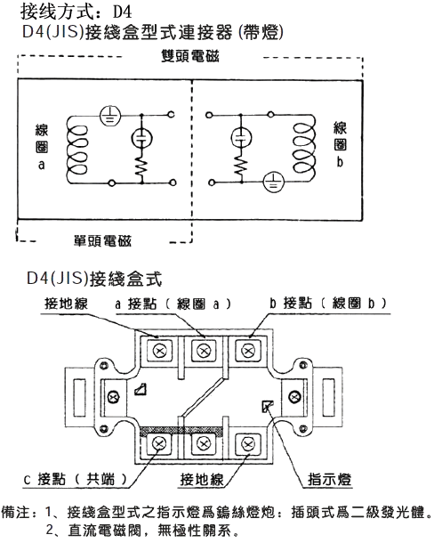 D4 -02 -2 B 2 L -A1 5 - 型號(hào)說明 規(guī)格 閥心機(jī)能 線圈型式 頻率 指示燈 閥位數(shù) 彈簧配置 閥芯型式 電磁鐵位置 D4:接線盒型