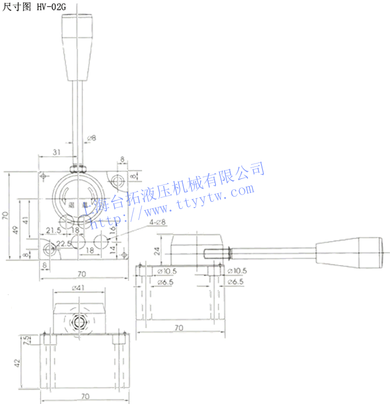 型 號(hào) 最大容許壓力kg/cm2 最大容許流量?/min 接線口徑 HF-02G 70 20 PT 1/4 調(diào)速閥HV-02G尺寸圖