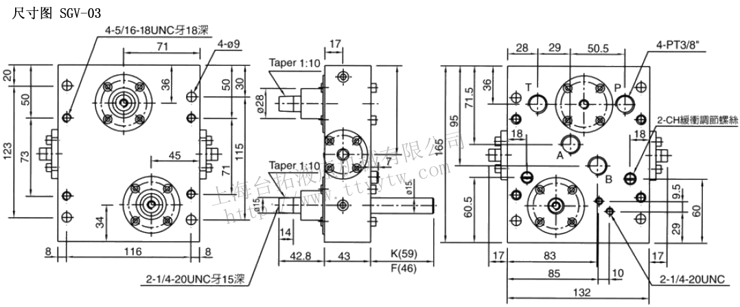 型號 最大流量?/min 最大壓力MPa 口徑 臺面 SGV-03-20 20 4 PT 3/8" 250×500 SGV-03-25 30 300×600 機(jī)械式方向閥SGV-03尺寸圖