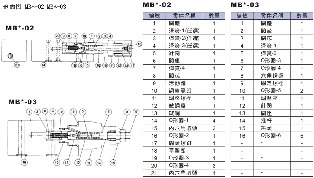 H:7.0~221.2 MBA-02 1.5 MBA-03 3.3 MBA-06 11.5 MBB-01 1.2 MBB-02 1.4 MBB-03 3.3 MBB-06 11.5 MBP-01 1.5 MBP-02 1.5 MBP-03 3.3 MBP-06 11.5 MBW-01 1.2 MBW-02 2.3 MBW-03 3.9 疊加式溢流閥MB*-02/03剖面圖