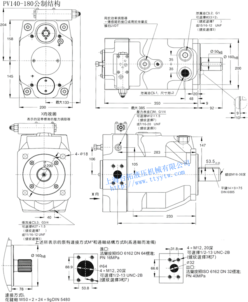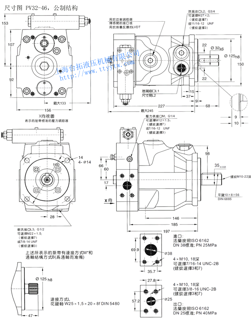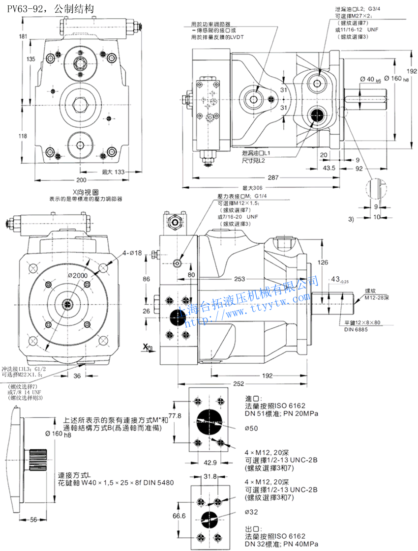 bar吐出量Pump Delivery(7Bar)100PSI 轉(zhuǎn)速 重量 1200RPM 1500RPM 1800RPM Max Min ml/rev in3/rev LPM U.S.GPM LPM U.S.GPM LPM U.S.GPM RPM RPM KG LB PV016 16 0.98 42 35 19.2 5.1 24 6.3 28.8 7.6 2750 300 19 41.8 PV020 20 1.2 24 6.3 30 7.9 36 9.5 PV023 23 1.4 27.6 7.3 34.5 9.1 41.4 40.9 PV032 32 1.9 38.4 10.1 48 12.7 57.6 15.2 2400 30 66 PV040 40 2.4 48 12.7 60 15.9 72 19 PV046 46 2.8 55.2 14.6 69 18.2 82.8 21.9 PV063 63 3.8 75.6 20 94.5 25 113.4 30 2100 60 132 PV071 71 4.3 85.8 22.7 107 28.3 128.7 34 PV080 80 4.8 96 25.4 120 31.7 144 38 2000 PV092 92 5.6 110.4 29.2 138 63.5 165.6 43.8 1900 PV140 140 8.5 168 44.4 210 55.5 252.1 66.6 2200 90 198 PV180 180 11 216 57.1 70 71.3 324 85.6 PV270 270 16.5 324 85.6 405 107 486 128.4 1800 172 378.4 可變量軸向柱塞泵PV016~PV270調(diào)節(jié)器說明/功率調(diào)節(jié)