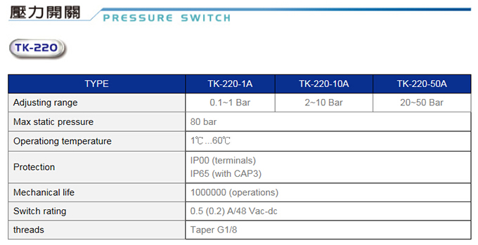 壓力開關(guān)TK-220規(guī)格表