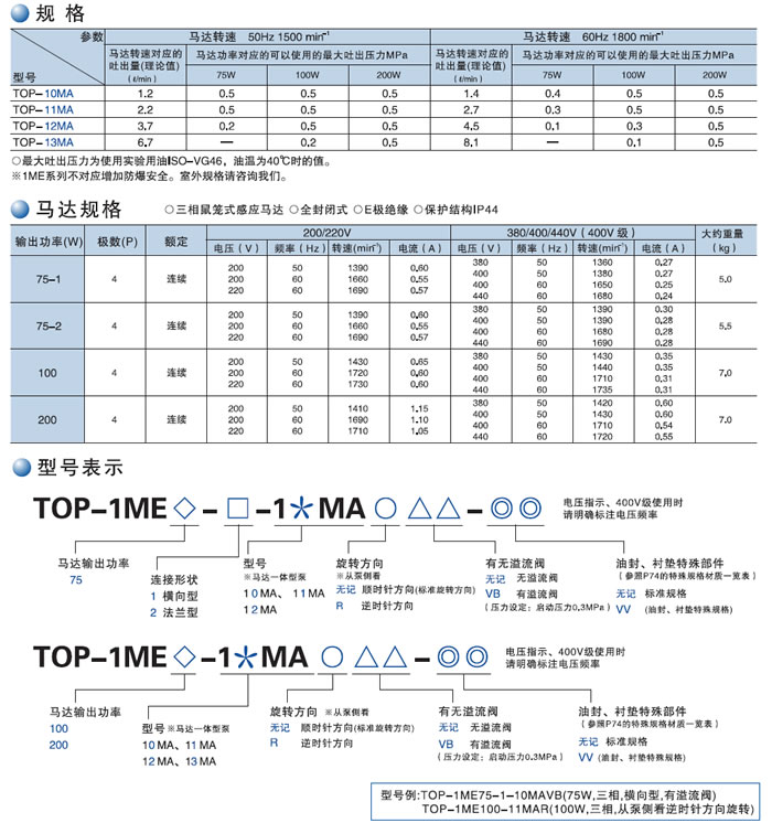 1ME(馬達(dá)一體型),馬達(dá)輸出功率75W/100W/200W。小型、輕量,小流量(0.8~4.5cm3/rev),低吐出壓。用途:輸送操作油、潤滑油,液體溫度:-5~80°C,適用的液體粘度:10~500mm2/sec。