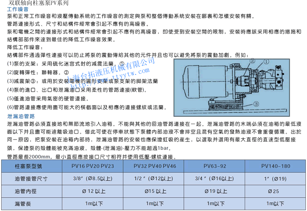 E:DC12V F:DC24V16/20/23+16/20/23 38 PV-40×16/20/23-** 40+16/20/23/40 49/60 PV-63/80/92×16/20/23 63/80/92+16/20/23 79 PV-63/80/92×40-** 63/80/92+40 90 PV-63/80/92×63/80/92 63/80/92+63/80/92 120 雙聯(lián)式軸向柱塞泵PV系列工作噪音及泄油管路